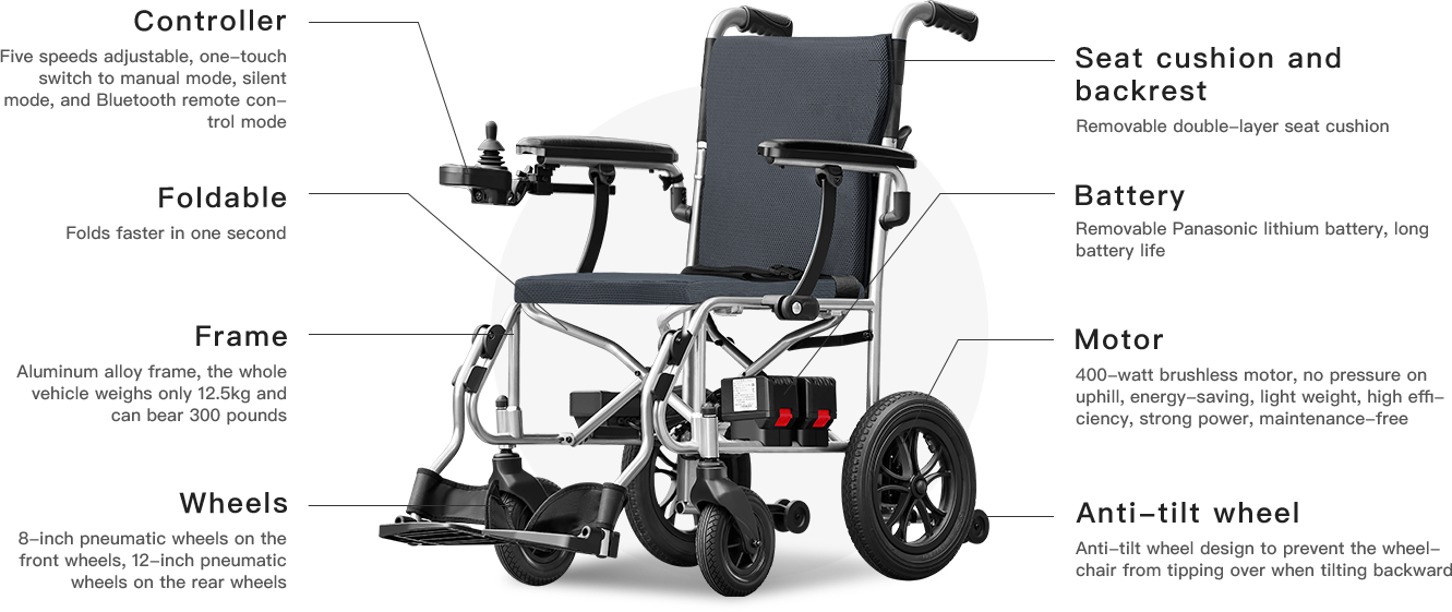 Long battery life, strong power, good on all terrain. Humanized design, easy to fold, easy to carry, worry-free travel. Intelligent control, safe and comfortable, making every trip easy and enjoyable.