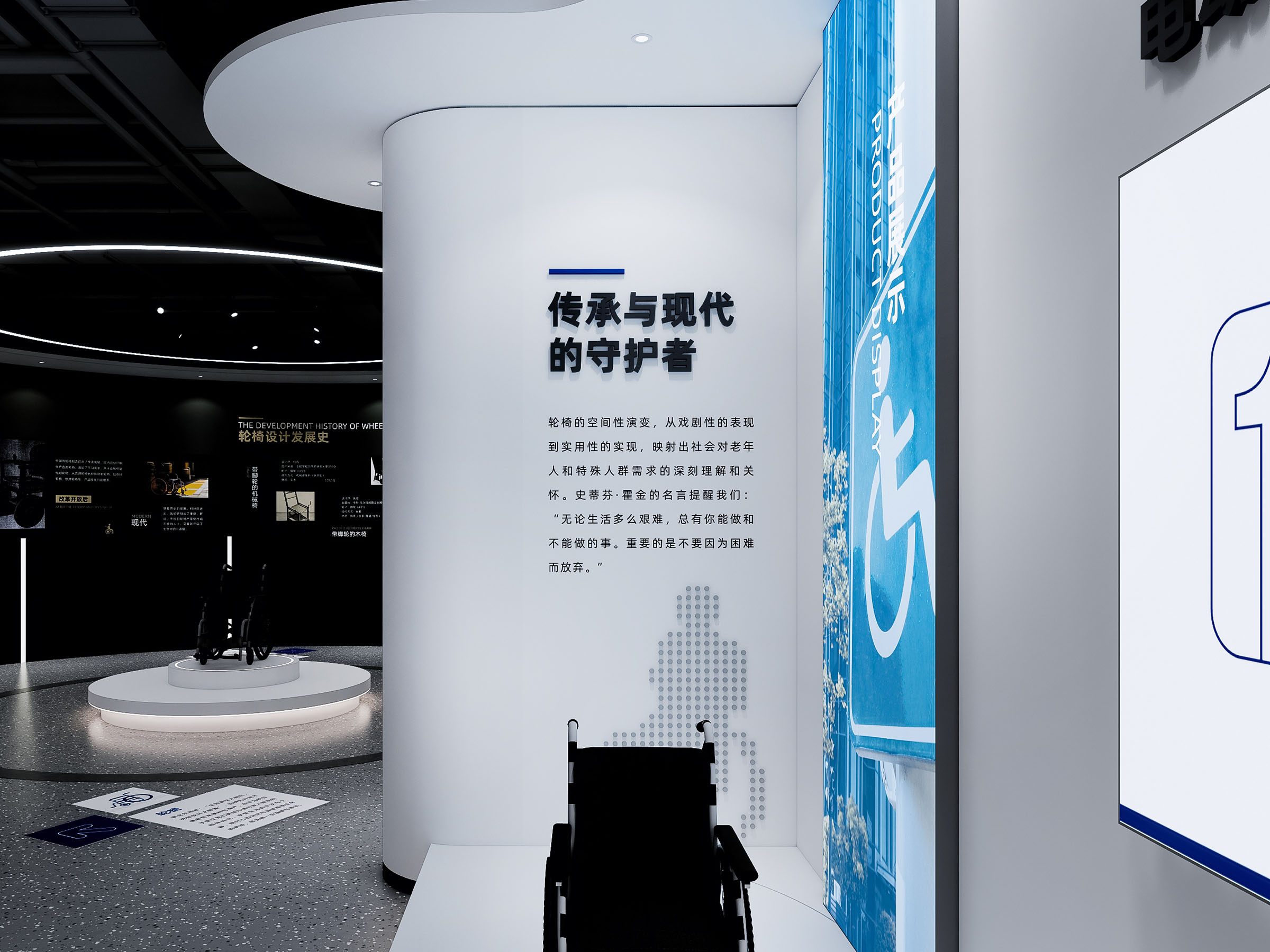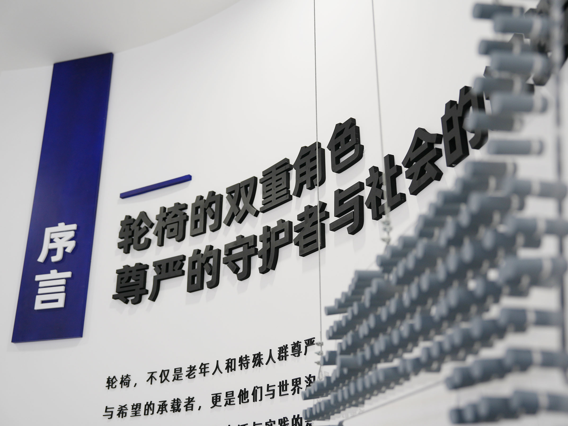 會(huì )議的第一站是互邦一樓展廳。展廳的主題是空間與權力,展廳占地面積約400平方米,進(jìn)入展廳首先映入眼簾的是序言:“輪椅,不僅是老年人和特殊人群尊嚴與希望的承載者,更是他們與世界溝通的橋梁?!边@段文字深刻揭示了輪椅的社會(huì )意義——它不僅是一種輔助工具,更是使用者尊嚴與希望的象征。